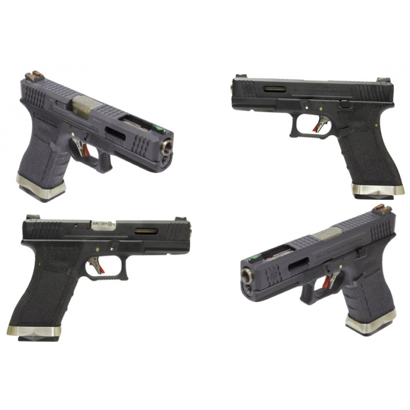 G-Force 17 BK Silver Barrel from WE is an improved replica of one of the most iconic modern pistol in the world. Mainly improvements are effective groves on the slide, high visibility fiber sights, thread in the barrel and magwell for quick reloads. Lightening cuts on the front of the slide also help to return on the target more easily after each shot. Undercutting the trigger guard and stippled grip are other improvements that allow to better recoil control thru higher grip. Outside construction as the original was made from metal (slide) and polymer (frame). Moving slide and strong gas blowback system gives the user a very realistic experience. On the inside, WE provided quality parts that ensure long time usage and precision of each shot.
