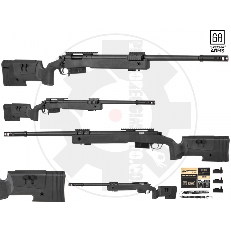 LA REPLICA DEL FUCILE DA CECCHINO SPECNA ARMS È DOTATA DI UN MECCANISMO BOLT-ACTION SEMPLICE E AFFIDABILE, IL CHE SIGNIFICA CHE LA REPLICA DEVE ESSERE RICARICATA PRIMA DI SPARARE. LA REPLICA È REALIZZATA IN METALLO E POLIMERO RINFORZATO. LE PARTI IN METALLO INCLUDONO L'INTERO SET DELLA CANNA ESTERNA, INSIEME ALLA CAMERA, AL GRILLETTO E ALLA MANIGLIA DI ARMATURE, OLTRE ALLE SLITTE PER GLI ACCESSORI RIS E A TUTTI GLI ELEMENTI DI MONTAGGIO COME LE VITI. IL TELAIO CON IL CALCIO, IL SUPPORTO DEL CALCIO E IL CARICATORE SONO STATI REALIZZATI IN POLIMERO SOLIDO. IL SUPPORTO DEL CALCIO È DOTATO DI UN COMODO SUPPORTO IN GOMMA, IL CUI SPESSORE PUÒ ESSERE REGOLATO TRAMITE UN SET DI SOVRAPPOSIZIONI INTERCAMBIABILI. INSIEME AL SUPPORTO GUANCIALE REGOLABILE, CONSENTE DI ADATTARE IL CALCIO ALLE PREFERENZE DELL'UTENTE. L'IMPIEGO DEL POLIMERO RINFORZATO NCORE RENDE LA COSTRUZIONE MOLTO RESISTENTE E LA FINITURA OPACA DEL TELAIO CONSENTE ALLE REPLICHE DEI FUCILI DA CECCHINO CORE DI PRODURRE UN'IMPRESSIONE STRAORDINARIA AL PRIMO SGUARDO. INOLTRE, GLI ELEMENTI METALLICI SONO RIVESTITI CON UNA FINITURA A NANORIVESTIMENTO CHE PREVIENE I GRAFFI. IL PORTAOTTURATORE È INCISO AL LASER CON LE MARCATURE SPECNA ARMS.