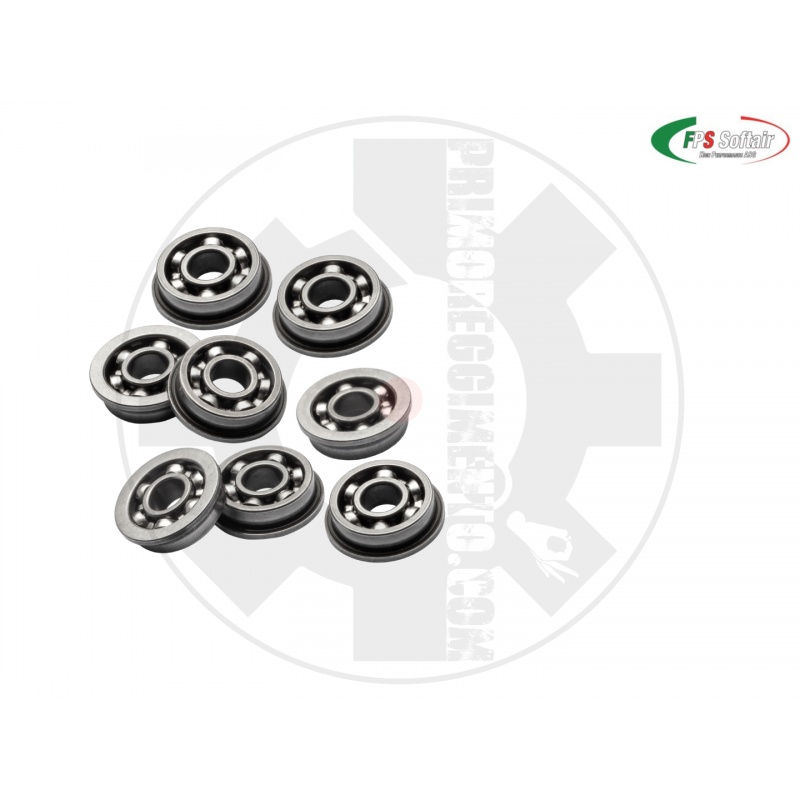Boccole da 8 mm cuscinettate in acciaio con cuscinetto aperto prodotte appositamente per VFC MP7 (BCMP7+). L'adozione di queste boccole diminuisce l'attrito dovuto alla rotazione degli ingranaggi. Questo vantaggio comporta sia una più elevata velocità di raffica che un miglior utilizzo dell'energia contenuta nella batteria. Il cuscinetto aperto garantisce una maggiore robustezza rispetto a quello chiuso in quanto le sfere che lo compongono sono di maggiori dimensioni. Un altro vantaggio di queste boccole è il minor spessore che non interferisce con selector plate e body dei fucili. Le dimensioni sono le seguenti: - Diametro esterno: 8 mm - Foro interno: 3 mm - Spessore: 2.5 mm