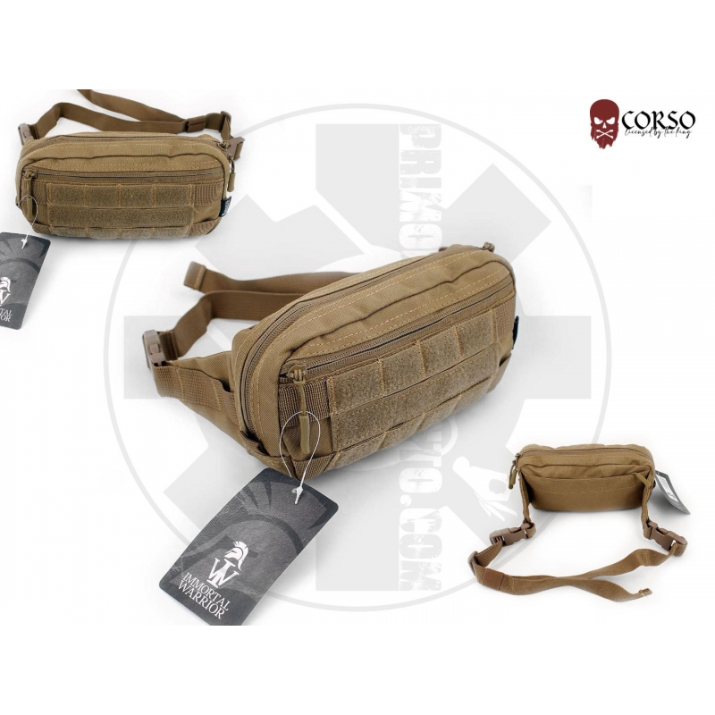 - small, compact fanny pack with Molle loops on front pocket - Molle loops with hook and loop surface to attach patches - 2 zipper pockets - main pocket with 2-way-zipper - main pocket with net pocket and wide elastic loops - adjustable hip strap with two sliding buckles