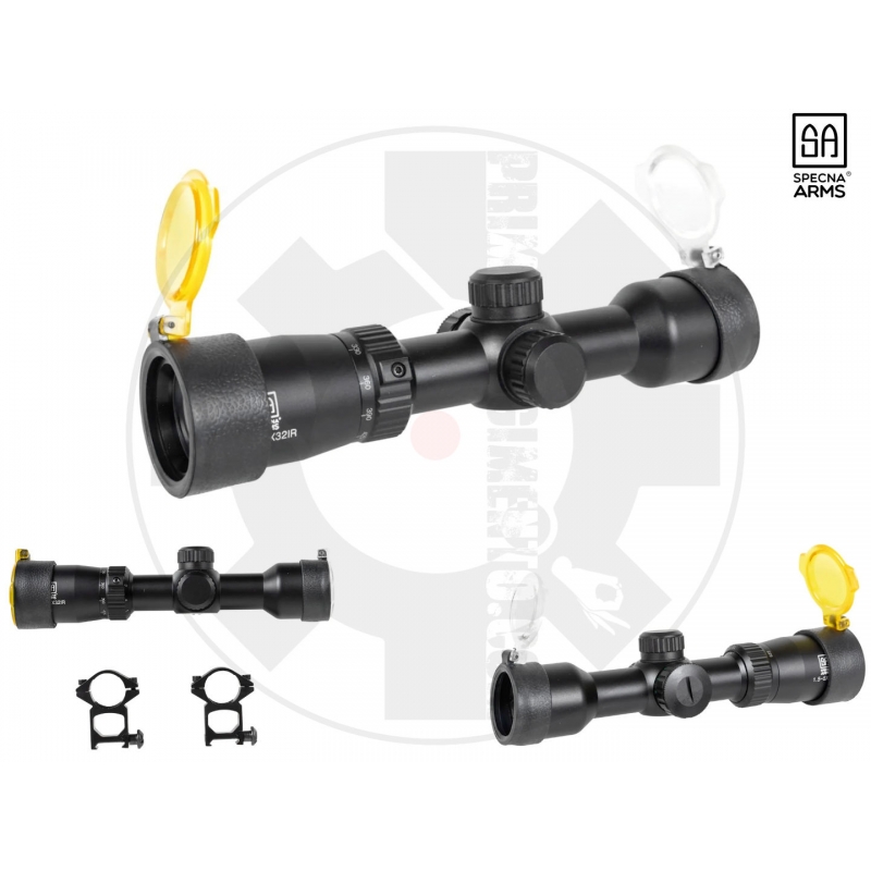 The scope from the manufacturer Specna Arms1.5-5x32 EG has the possibility to illuminate the crosshairs in three colours; red, green, blue, which will facilitate the efficient operation of the rifle even during night games (each colour has 3 levels of illumination intensity). The scope has a variable magnification of x1.5-5, which will allow it to be used in a wide range of operations, regardless of the type of scenario, and the transparent covers make the scope safe even during heavy shooting. The scope features a high-strength, mil-dot aiming crosshair, and convenient knobs will allow vertical-horizontal adjustment (1 click = 1/4" at 100 yards). A two-piece mount is included for mounting on a RIS rail.
