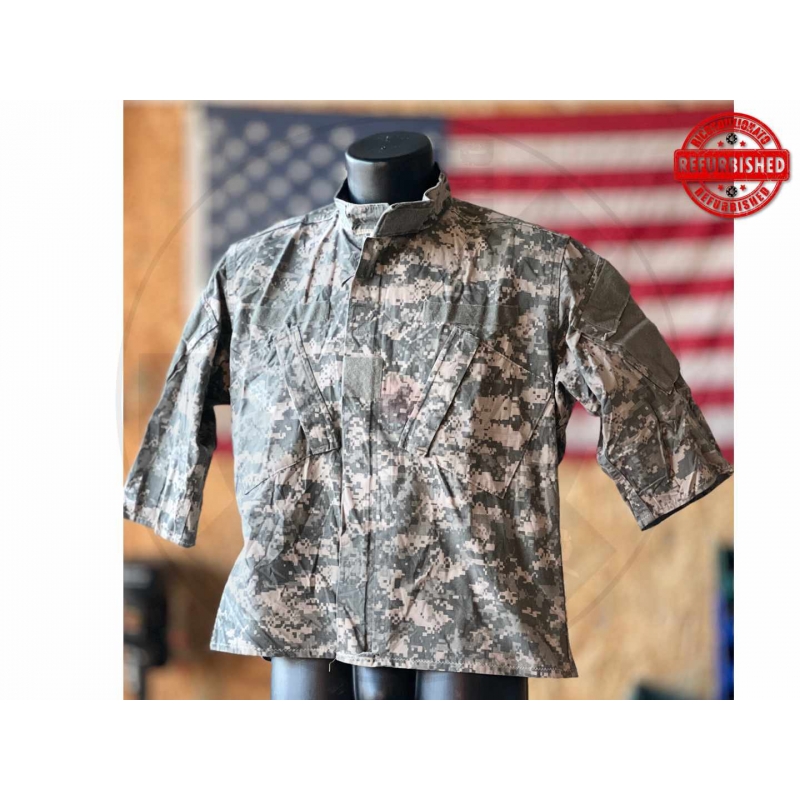* originale militare USA * modello Army Combat Uniform coat * pattern UCP digitale * taglia etichetta: Medium Long * taglia NATO: 8090/9404 * NSN: 8415-01-519-8512 * contract number: SPM1C1-10-D-1069 * contractor: Coat, Army Combat Uniform * materiali: 50% nylon / 50% cotone ripstop * marcatura Team Soldier Certified Gear U.S. Army * chiusura anteriore con zip e patta * periodo indicativo: circa 2010 * capo modificato: maniche pesantemente accorciate e parte bassa tagliata * vestibilità reale alterata rispetto alla taglia originale * utile anche per progetti creativi, costume o custom * condizioni: usato con modifica evidente e permanente