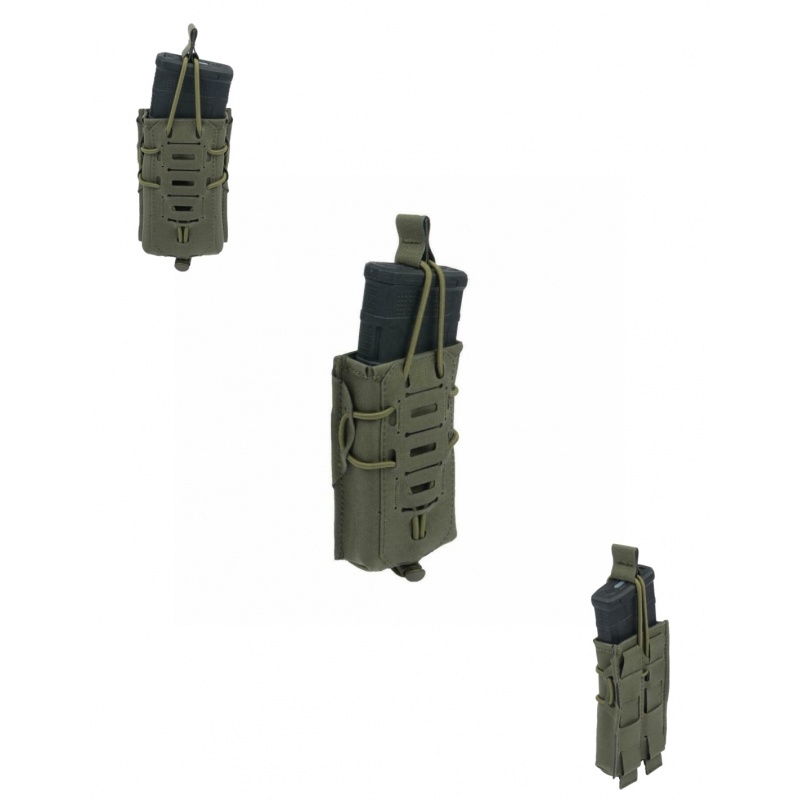 DESCRIPTION This pouch is designed to carry a single AR15 or AK-74 magazine and be as light and functional as possible. This has been achieved by making the pouch slightly deeper. This allowed to secure longer AK-type magazines, however is not hindering taking out AR15 magazine. Both types of magazines can be firmly secured by a bungee cord with a puller, while retention strength can be adjusted with a small regulator at the bottom of the pouch. The pouch has a monolytic design and is made of of IRR treated Cordura 500D “Baucent” laminate. Small laminate panel on the front of the pouch allows to attach additional MOLLE equipment. MOLLE attachments on the backside is made of stiffer Cordura 1000D-based laminate.