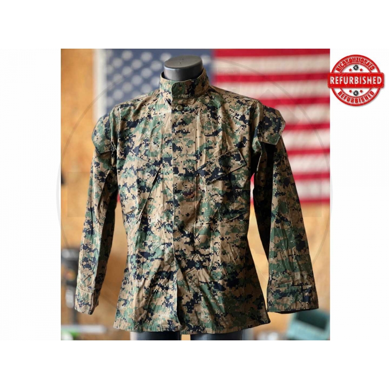 Blusa mimetica originale militare U.S. Marine Corps in pattern Woodland MARPAT, taglia Small Regular. Dalle etichette visibili si riconosce come MCCUU dei Marines, con stemma EGA ricamato sul taschino e produzione Kandor MFG. Capo classico da uniforme USMC, in colorazione woodland digitale molto riconoscibile.
