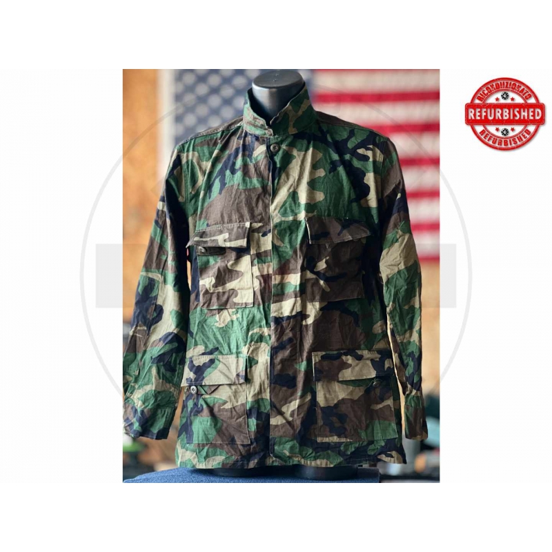Giacca originale militare USA in classico pattern Woodland, modello hot weather combat coat. È un capo leggero ma robusto, adatto sia a collezione sia a uso outdoor o softair. La contract label conferma una produzione militare originale anni ’90 in 100% cotone.
