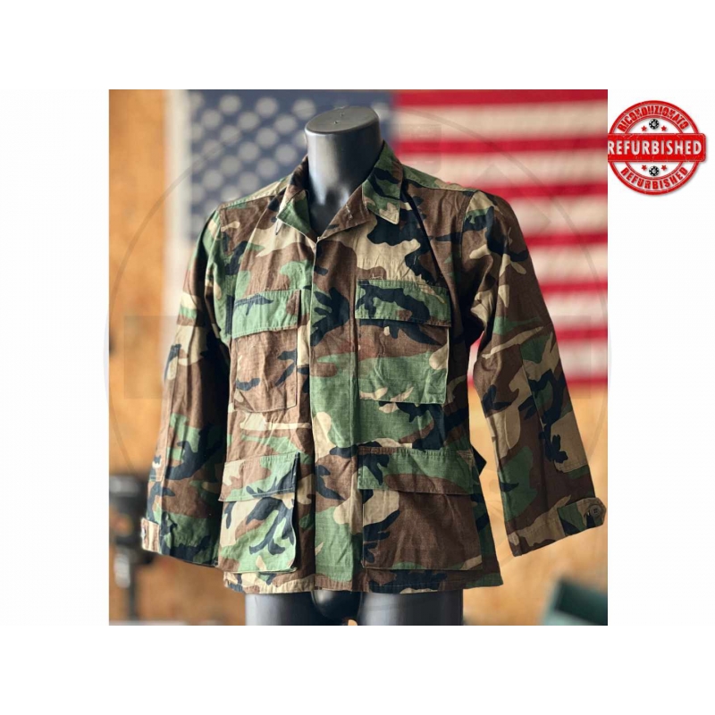 Giacca originale militare USA in classico pattern Woodland, modello hot weather combat coat. È un capo vero da uniforme, in 100% cotone ripstop, leggero ma robusto, molto interessante anche per utilizzo outdoor, softair o collezione. Dall’etichetta interna si ricava una produzione riconducibile alla metà degli anni ’80.