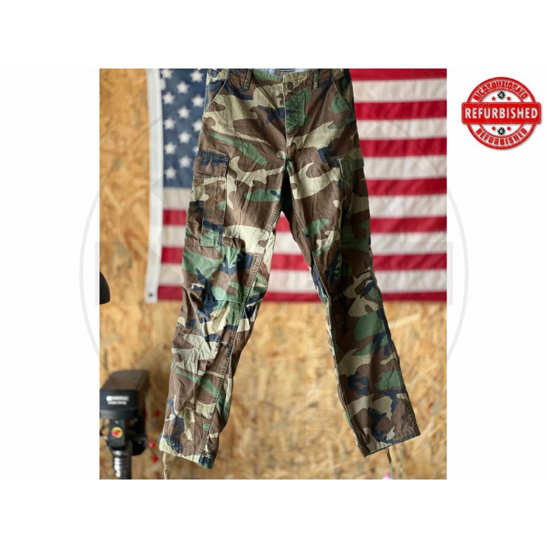 * originale militare USA * U.S. Army * periodo indicativo: 1992 * trousers, combat, woodland camouflage pattern * pattern Woodland * taglia in etichetta Small Long * inseam indicato: over 32 1/2 in. * waist indicata: 27 to 31 in. * stock no.: 8415-01-084-1710 * NATO size: 8380/6779 * contratto: DLA100-92-C-0311 * produttore: Cutter Industries, Inc. * composizione 50% cotone / 50% nylon * chiusura anteriore con bottoni * regolazione in vita tramite straps laterali * condizioni: in buone condizioni generali, capo ben tenuto con normali segni d’uso