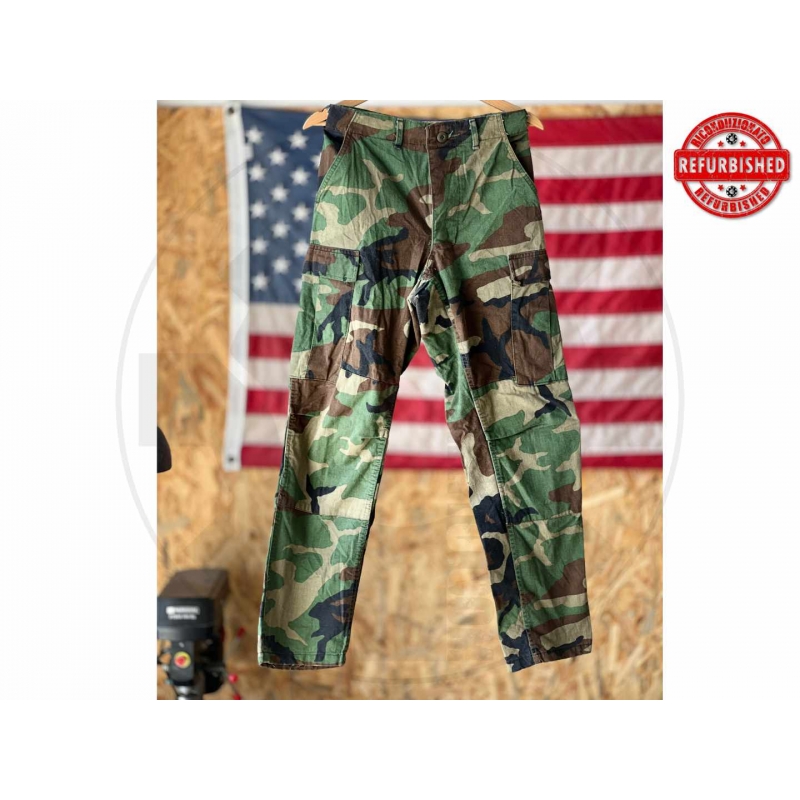 Pantaloni originali militari USA in pattern Woodland, classico modello combat trousers molto apprezzato per collezione, reenact e outdoor. Capo in buone condizioni generali, con taglio pratico e robusto. Le etichette interne sono presenti ma molto usurate, quindi alcuni dati risultano solo parzialmente leggibili.