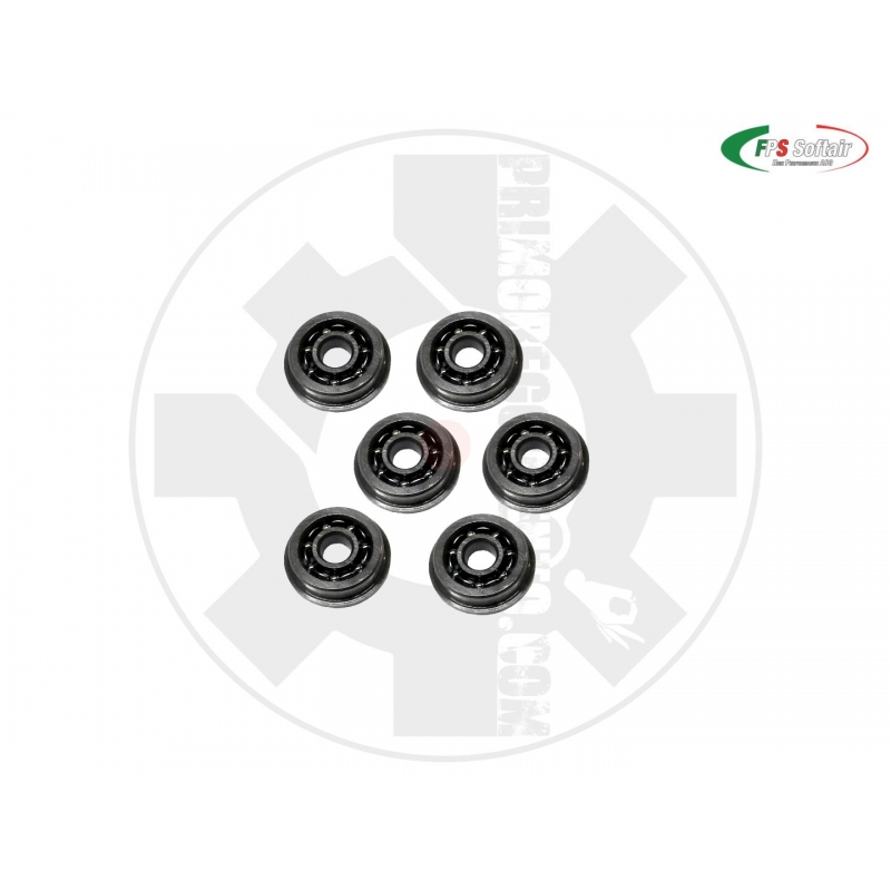 Boccole da 9 mm cuscinettate in acciaio con cuscinetto aperto (B9CA). L'adozione di queste boccole diminuisce l'attrito dovuto alla rotazione degli ingranaggi. Questo vantaggio comporta sia una più elevata velocità di raffica, che un miglior utilizzo dell'energia contenuta nella batteria. Il cuscinetto aperto garantisce più elevata robustezza rispetto a quello chiuso in quanto le sfere che lo compongono sono di maggiori dimensioni. Un altro vantaggio di queste boccole è il minor spessore che non interferisce con selector plate e body dei fucili. Le dimensioni sono: - diametro esterno: 9 mm - foro interno: 3 mm - spessore: 2.5 mm 100% MADE IN ITALY