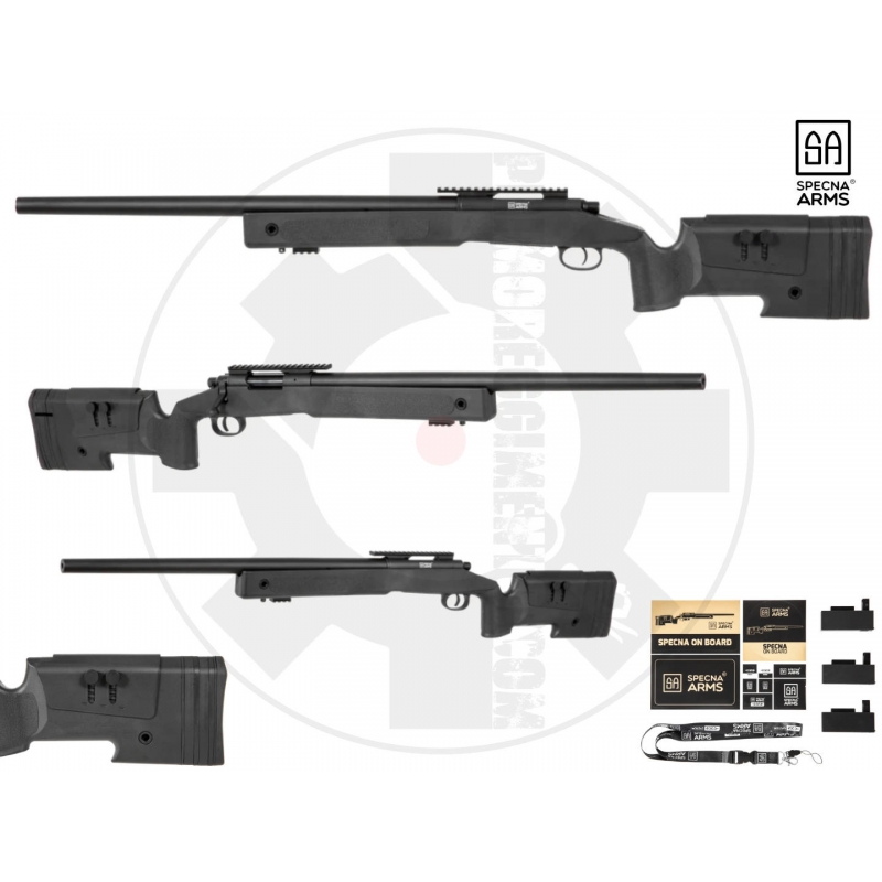 Specna Arms sniper rifle replica features a simple and reliable bolt-action mechanism, which means the replica needs to be reloaded before firing. The replica is made of metal and reinforced polymer. Parts made of metal include the entire set of the external barrel along with the chamber, trigger and charging handle as well as RIS accessory rails and all assembly elements such as screws. The chassis with the stock, stock pad and the magazine were made of solid polymer. The stock pad features a comfortable, rubber pad, whose thickness can be adjusted using a set of exchangeable overlays. In combination with the adjustable cheek pad it enables adjusting the stock to user preferences.