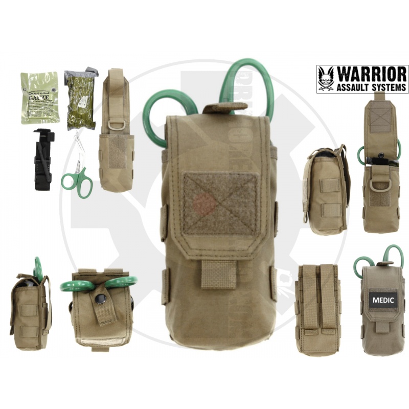 Warriors IFAK pouch is designed to hold an operators personal medical kit, Combat Gauze, CAT and Trauma Bandage. Medical shears can be stored securely at the rear of the pouch to allow quick and easy access. Internally we have introduced a webbing strap, which threads under your med kit and when pulled seamlessly elevates the contents of the pouch with one hand. Both sides of the pouch have additional external webbing for attachment of extra CATs or smaller pouches etc. The lid of the pouch has a Velcro square for attachment of First Aid patch etc. Warriors IFAK occupies only 2 rows of MOLLE webbing so it can be mounted on any amour carrier, chest rig or fits perfectly on the rear of Warriors PLB Belt, Gunfighter Belt or Frag Belt. Height 7 inch or 18cm Width 4 inch or 10cm Depth 3 inch or 8cm