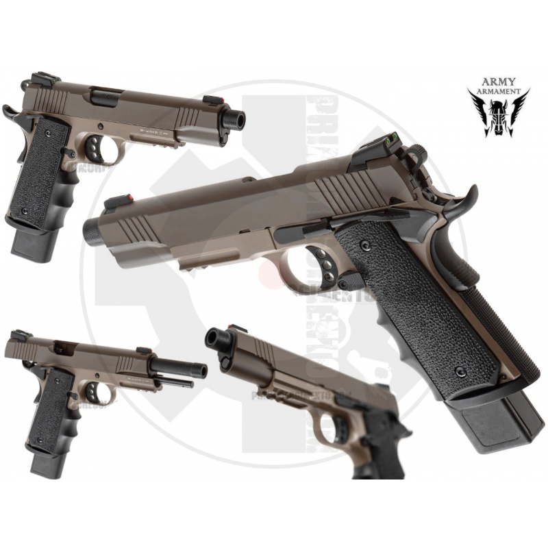 The M1911, manufactured by Army Armament, is a full metal, semi-automatic replica of one of the most iconic pistols in the world. It was launched with the explicit mission of enhancing certain essential features of 1911-style handguns. It is powered by gas, weighs 950g, has a length of 235 mm, and offers a magazine capacity of 26 rounds. The M1911 uses a 110 mm long inner barrel and generates approximately 320 FPS.