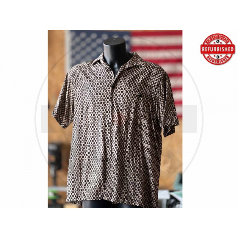 Camicia estiva J. Ferrar in rayon lavabile, con fantasia a microquadri beige e nero dal look molto particolare e versatile. È un capo commerciale vintage, con un’impronta più urbana rispetto alla classica hawaiana floreale, ma comunque perfetto per outfit estivi, casual o retro.