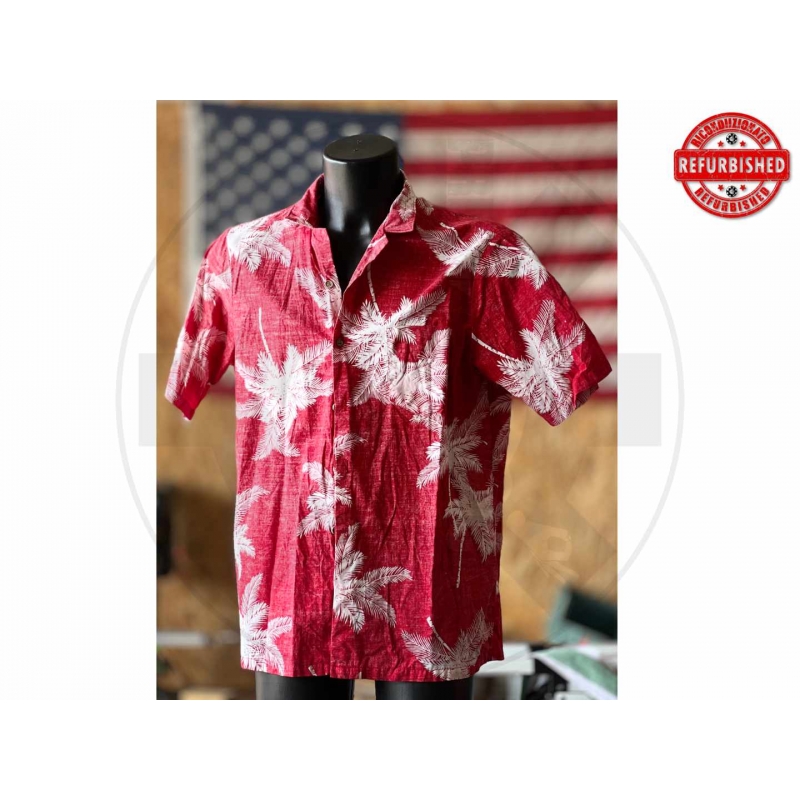 Camicia hawaiana commerciale dal look molto estivo e immediato, con fantasia a palme bianche su base rossa. È un capo semplice ma d’effetto, facile da abbinare e molto adatto alla stagione estiva o a un outfit vacanziero dal gusto classico.