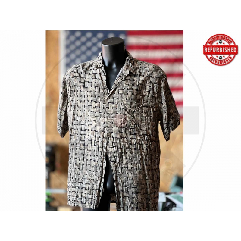 Camicia hawaiana commerciale dal look sobrio e particolare, con fantasia geometrica intrecciata sui toni del marrone, beige e nero. È un capo estivo più discreto rispetto alle hawaiane classiche più accese, ma con uno stile vintage molto gradevole e facile da portare.