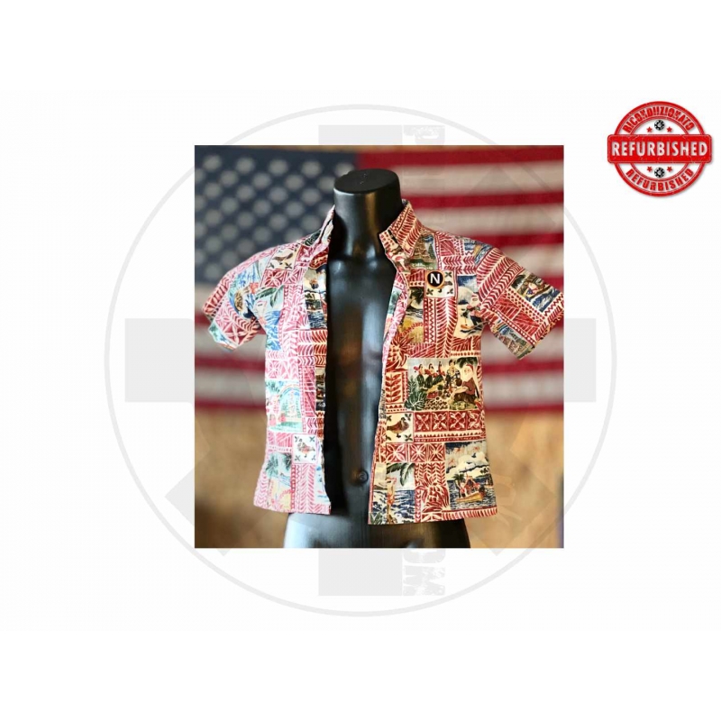 Camicia hawaiana Mele Kalikimaka by Reyn Spooner, limited issue, con fantasia natalizia hawaiana molto particolare nei toni rosso, bianco, verde e azzurro. Capo commerciale dal look davvero originale, perfetto per Natale, eventi a tema o per chi cerca una hawaiana diversa dal solito. Presente anche una patch applicata con lettera N sul petto.