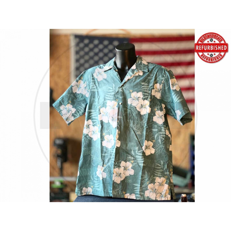* commerciale * brand Go Barefoot * fantasia ibiscus tropicali * taglia etichetta XL-TALL * chiusura con bottoni * 100% cotone * Made in U.S.A. * RN 36979
