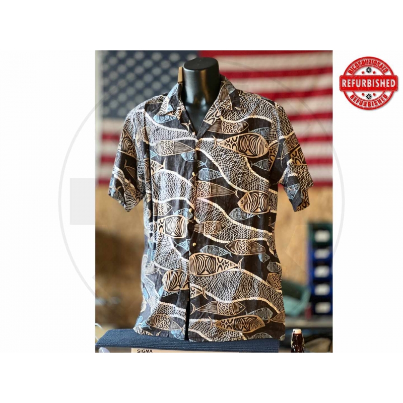 Camicia hawaiana Go Barefoot con fantasia a tema marino molto forte e riconoscibile, con pesci stilizzati e reti su base scura. Capo commerciale di produzione USA, perfetto per outfit estivi, tempo libero o look vintage tropicale dal grande impatto visivo.