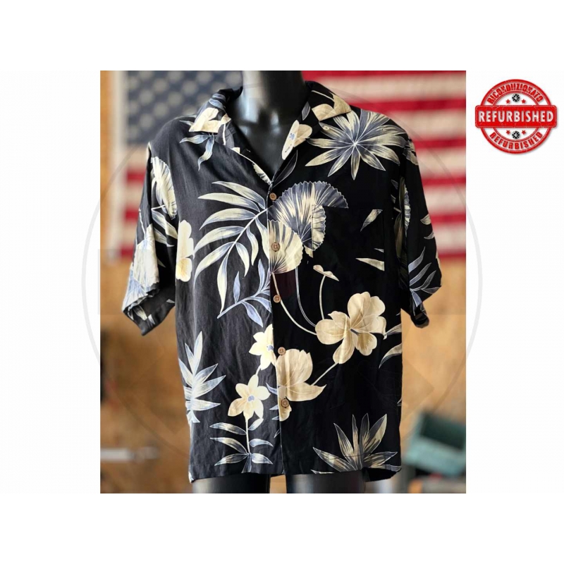* commerciale * brand Jamaica Jaxx * fantasia floreale tropicale * taglia XL * chiusura frontale con bottoni * taschino sul petto * materiale cotone * colore base nero * stampa floreale beige e azzurro