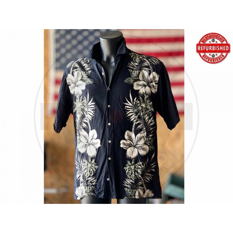 Camicia hawaiana commerciale dal look classico e molto elegante, con base nera e grande fantasia tropicale floreale nei toni del beige, verde salvia e grigio. È un capo estivo ben riuscito, con uno stile più raffinato rispetto alle hawaiane più accese, perfetto per outfit casual, vacanza o serate estive.