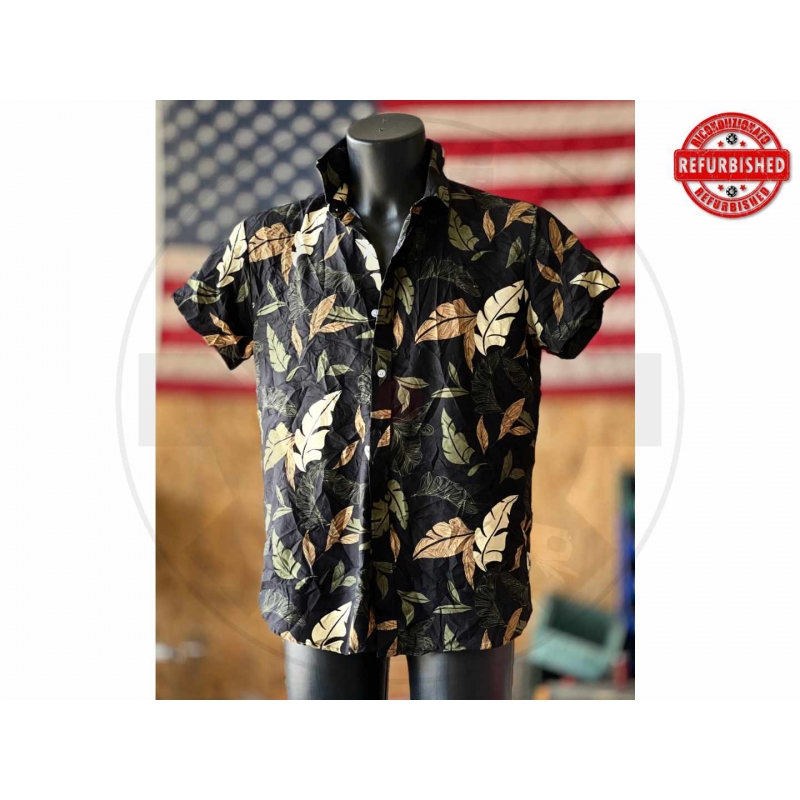 Camicia hawaiana commerciale dal look estivo pulito e versatile, con base nera e fantasia foliage nei toni del verde oliva, beige e ocra. È un capo facile da portare, con una grafica tropicale più sobria rispetto alle hawaiane classiche più accese, adatto per outfit casual, vacanza o tempo libero.