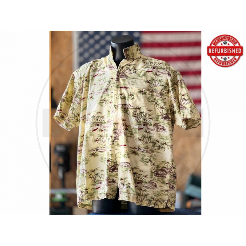 Camicia hawaiana commerciale GAP con classica fantasia tropicale su base giallo chiaro, con palme, canoe e capanne in stile isola. Capo estivo molto pulito e facile da portare, perfetto per outfit casual, vacanza o tempo libero.