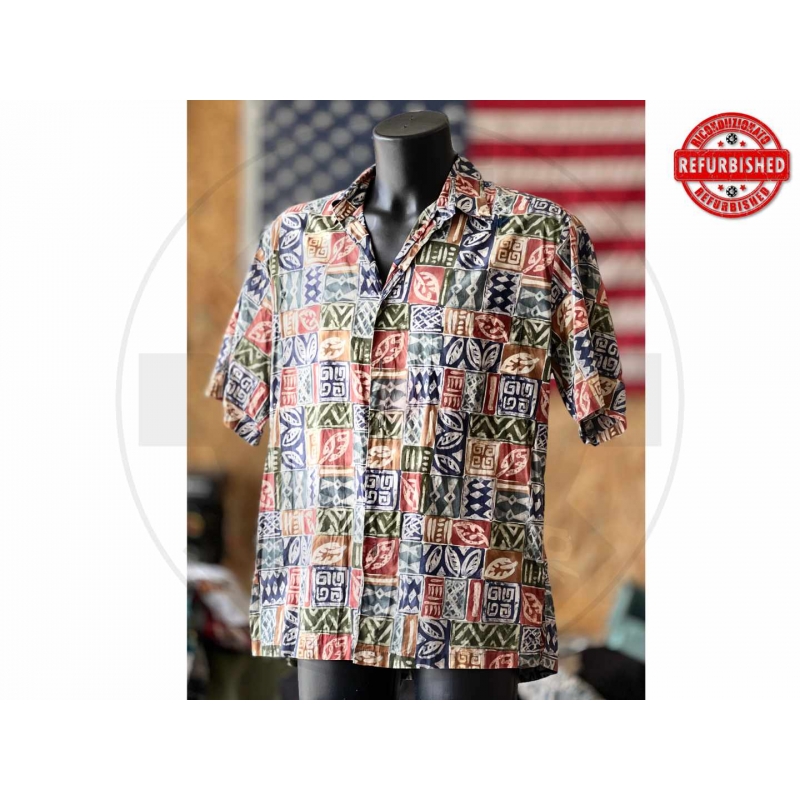 Camicia hawaiana molto bella e riconoscibile, con fantasia patchwork tropicale nei toni blu, verde, mattone e sabbia. È un modello dal look classico ma molto visivo, con una grafica ben riuscita e un taglio che la rende perfetta per chi cerca una hawaiana di qualità con forte personalità.
