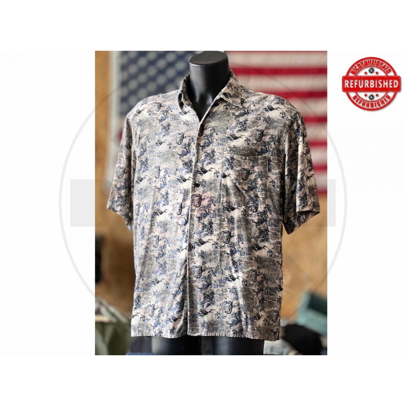 Camicia hawaiana dallo stile più elegante e ricercato, con fantasia tono su tono beige, grigio e blu dal look molto vintage. Il tessuto in seta la rende più interessante rispetto ai modelli comuni e la stampa ha un impatto sobrio ma particolare, facile da portare anche fuori dal classico contesto estivo.