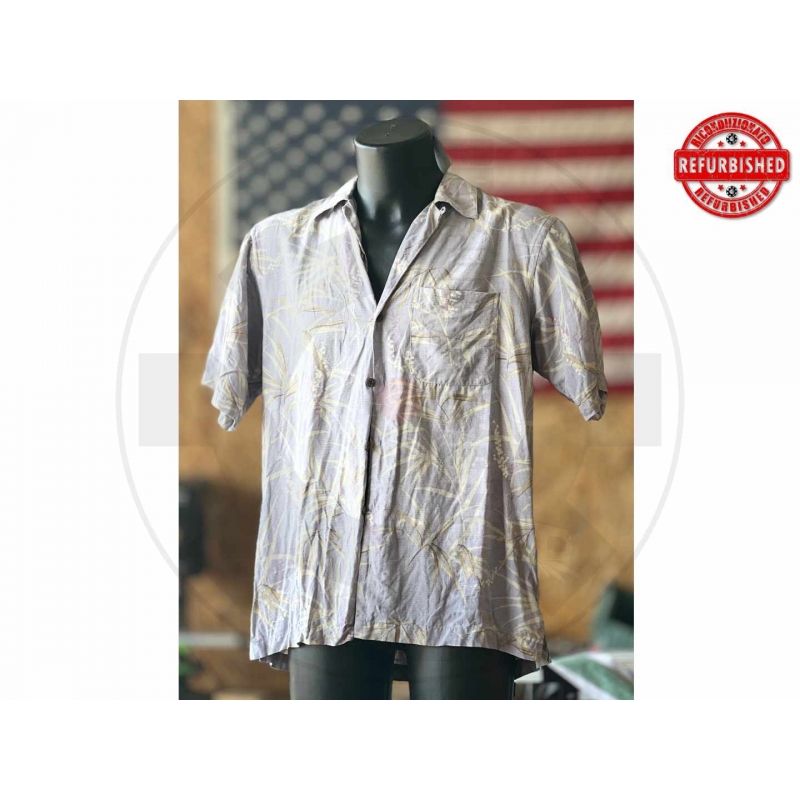 TCamicia hawaiana commerciale Geoffrey Beene in taglia M, con fantasia tropicale molto pulita e discreta sui toni lilla, beige e verde chiaro. È un capo leggero e piacevole da indossare, con un look più elegante e sobrio rispetto alle hawaiane più accese.