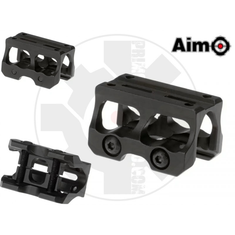 A CNC machined, aluminum alloy red dot mount manufactured by Aim-O. The product features skeletonized construction with a standard Picatinny rail adapter. The item is coated in a black, non-reflective finish and is compatible with the Trijicon MRO footprint.