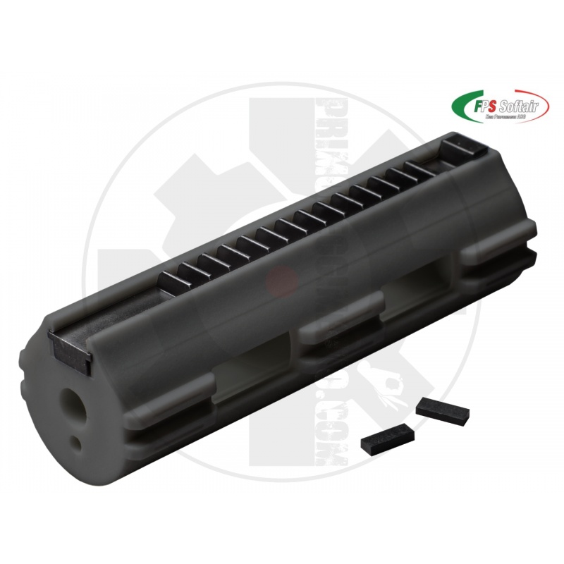 Questo sistema brevettato da Fps consente di attenuare le sollecitazioni che la cremagliera trasmette al corpo pistone, rendendo l'insieme enormemente più resistente e affidabile rispetto ad un normale pistone. Per il materiale del corpo è stato studiato un tecnopolimero caricato con fibra di carbonio e aggiunta di una piccola percentuale di elastomero che conferisce elevate performances meccaniche ed un bassissimo coefficiente di attrito.