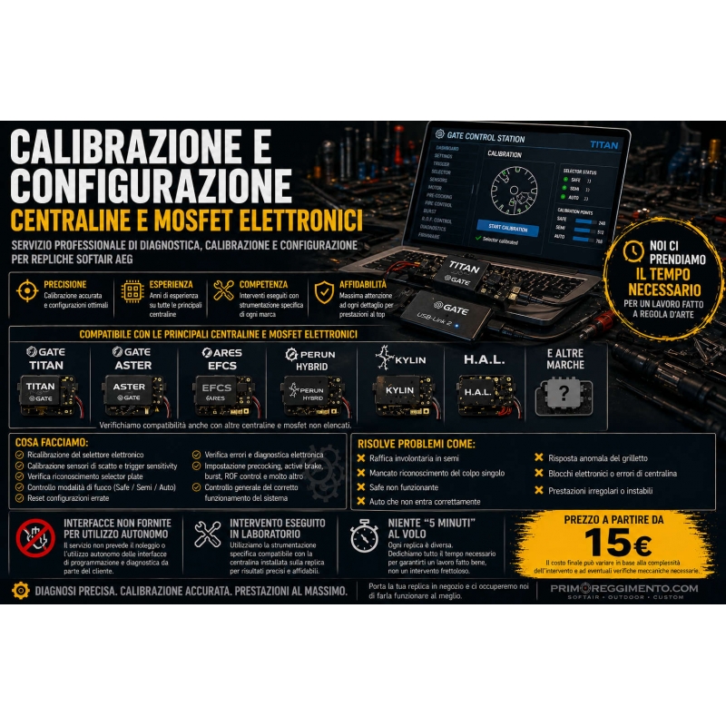 Servizio professionale di calibrazione, aggiornamento, taratura, configurazione e diagnostica per sistemi elettronici Gate installati su repliche softair AEG, incluse centraline Gate Titan, Gate Aster e altri mosfet programmabili.