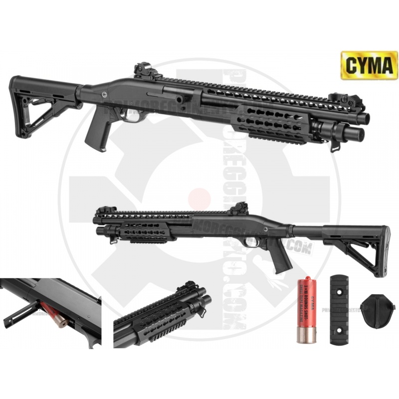 CM366 weights around 1600g and shoots in 3rds burst from three internal barrels with a typical pump-action reload motion. The forend is manufactured in a modernized version with KeyMod slots and RIS rails for additional attachments and carrying slings.