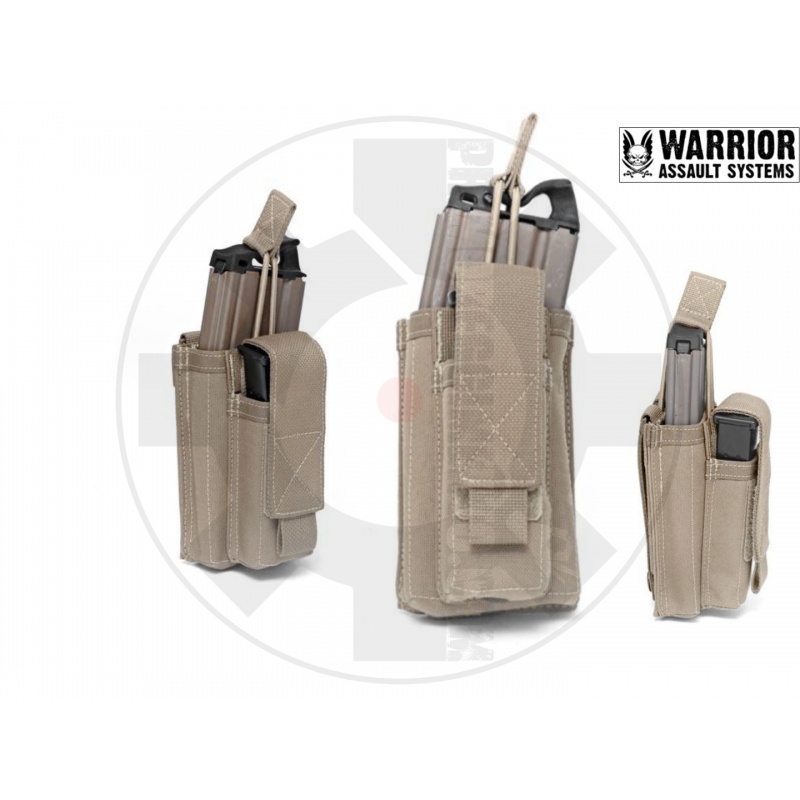 Warrior’s renowned Single Open D.A. 5.56mm is now available with the addition of a 9mm pistol mag pouch attached to the front. This “Kangaroo” pouch holds 5.56mm x 45mm M4 style metal and polymer mags. (NOT G36 mags). The main compartment is accessed via bungee retension with the front pistol mag pouch being accessed via a Velcro lid this has internal adjustments for height to accommodate varying size mags.